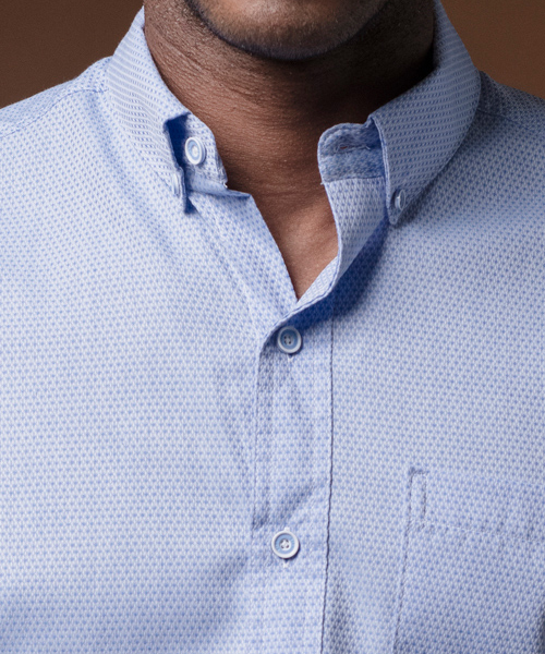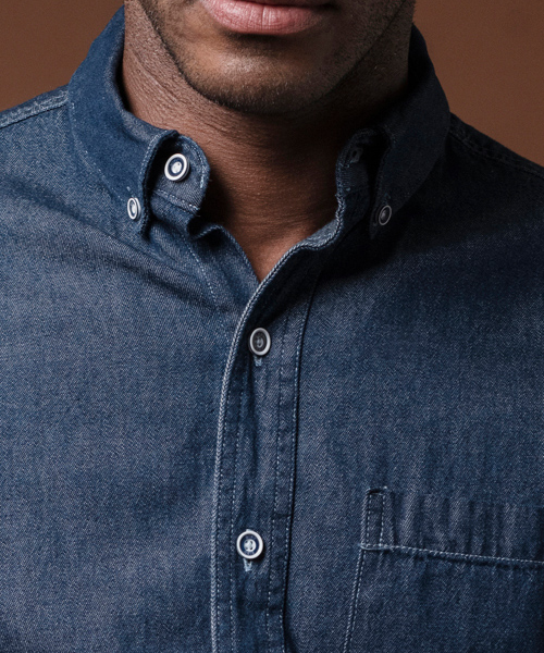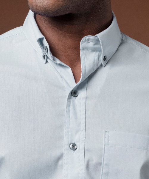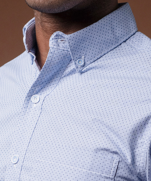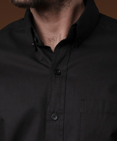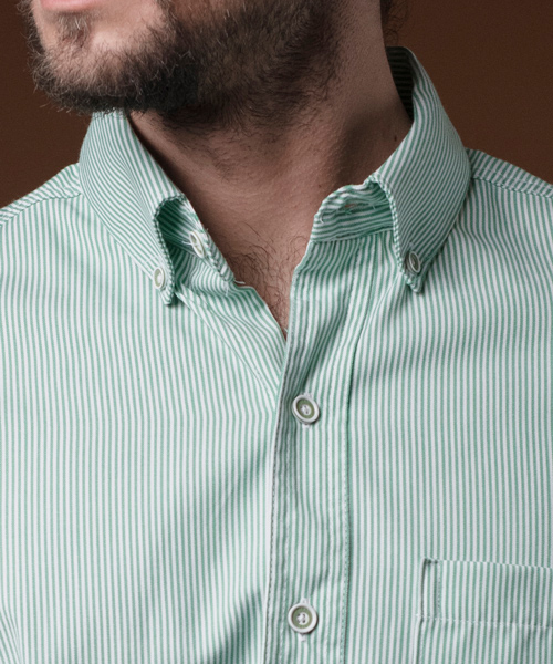COSTURAS DOBLES, ALETILLA REFORZADA CON ENTRETELA COSIDA CON CUATRO AGUJAS, OJAL Y BOTÓN EN CUELLO.