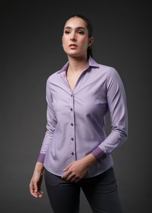 COMBINACIÓN EN PUÑOS, PIE DE CUELLO Y ALETILLA INTERNA, CONTRASTE DE COLOR EN OJAL