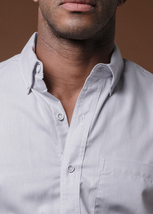 COSTURAS DOBLES, ALETILLA REFORZADA CON ENTRETELA COSIDA CON CUATRO AGUJAS, OJAL Y BOTÓN EN CUELLO.