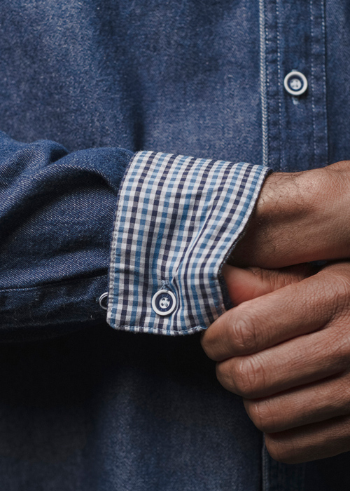 COMBINACIÓN EN PUÑOS, PIE DE CUELLO Y ALETILLA INTERNA, CONTRASTE DE COLOR EN OJAL