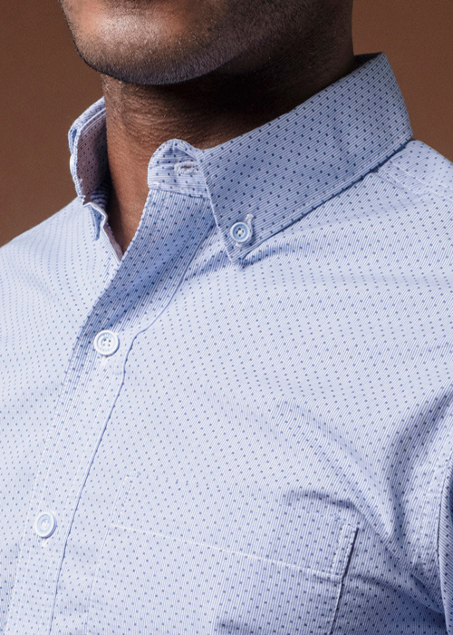 COSTURAS DOBLES, ALETILLA REFORZADA CON ENTRETELA COSIDA CON CUATRO AGUJAS, OJAL Y BOTÓN EN CUELLO.